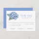 Hydrangea bleu élégant pour votre carte de réponse de mariage de printemps ou d'été avec trois choix de menu à personnaliser. Parfait pour le mariage traditionnel mais élégant que vous avez en tête. Police serif classique avec typographie de script moderne. Œuvre d'art originale d'hydrangea uniquement trouvée ici. Pour les demandes de modifications de conception personnalisées par le concepteur indépendant, veuillez envoyer un courriel à paula@labellarue.com AVANT de personnaliser ou de passer une commande.