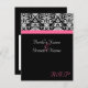 Carte RSVP pour aller avec notre faire-part de mariage à fond noir élégant avec accent rose magenta fuchsia. Fond noir frais et élégant avec accent damassé noir et blanc, et bande horizontale colorée. Personnalisez en ligne avec vos détails de mariage.