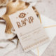 Une carte de réponse de mariage occidental moderne présentant des tons neutres chauds et des motifs audacieux inspirés du sud-ouest. Parfait pour les mariages à la ferme, dans le désert ou en plein air avec une ambiance western semi-formelle. Disponible sous forme d'invitations imprimées professionnellement ou de fichier numérique pratique pour un partage facile.