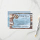 Carte de réponse pour les invitations assorties avec un design à thème nautique comprenant du bois vieilli et des vagues océaniques ainsi qu'une image d'une ancre et d'un nœud en forme de cœur dans une corde.