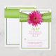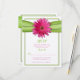 Carte de réponse ou RSVP de mariage avec fleur de gérbera rose et ruban de satin vert simulé. Les couleurs de cette carte sont vert, rose et crème. Cette carte est actuellement configurée pour être imprimée sur du papier feutré, mais elle aurait fière allure sur n'importe quel autre type de papier. Si elle est placée sur d'autres types de papier, la couleur de fond sera blanche. Modifiez le texte pour utiliser ceci à d'autres fins également.