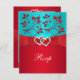 Cette carte de réponse de mariage romantique turquoise, bleu et rouge avec un ruban rouge IMPRIMÉ avec une paire de bijoux diamantés IMPRIMÉS et un cœur à boucle en faux strass rouges assortis à l'invitation de mariage présentée ci-dessous. Tout le texte et le choix du papier sont personnalisables. ***VEUILLEZ NOTER qu'il n'y a pas d'éléments en relief sur cette carte. Tout est imprimé à plat. Il est présenté ici sur du papier basique, mais il scintillerait encore mieux sur du papier métallisé "glace" lustré, qui a un aspect métallisé subtil qui ne décolore pas le design. ***VEUILLEZ NOTER que si vous changez la police ou la taille de la police, cela peut modifier la façon dont votre invitation s'imprime. Il s'imprimera tel que vous le voyez sur votre écran, donc si vous avez des problèmes d'alignement ou de taille, veuillez me contacter pour obtenir de l'aide. Je ne verrai pas votre invitation une fois que vous l'aurez commandée, et Zazzle