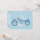 Une moto aux nuances de bleu et de violet avec des courbes et des tourbillons doux se dresse contre un treillis blanc sur fond floral bleu remplissant cette carte de réponse d'invitation de mariage de motard avec romance. De mon image originale créée numériquement.