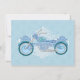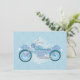 Une moto aux nuances de bleu et de violet avec des courbes et des tourbillons doux se dresse contre un treillis blanc sur un fond floral bleu remplissant cette carte de réponse d'invitation de mariage de biker avec de la romance. De mon image originale créée numériquement.