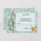 Invitation de mariage ou carte incluse à thème nautique ou de plage avec deux chevaux marins sur un fond d'eau avec une étoile de mer. Cette carte correspond à plusieurs invitations de mariage et de mariée.