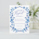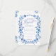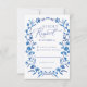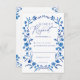 Carte de réponse à l'aquarelle bleu floral. Cette invitation a un style doux et élégant avec un cadre floral bleu muet qui semble intemporel. De délicates illustrations florales bleues sur les côtés apportent une touche de coquette et de charme d'inspiration nature. L'aménagement est propre et organisé, avec un alignement centré et un espacement clair pour créer un look raffiné. A un thème inspiré de la toile française. Dans l'ensemble, le design est romantique mais sobre, parfait pour un mariage moderne mais traditionnel.