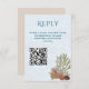 Carte de réponse du mariage de mer vivant. Design vertical avec éléments de mer qui comprennent une coquille de conque, corail de mer et coquilles de Saint-Jacques. Une image d'eau recouverte de l'arrière - plan et texte est de couleur bleu marine profonde. Ajoutez un petit paragraphe pour les invités et utilisez le modèle pour ajouter votre adresse de code QR.