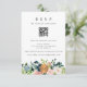 Carton de réponse pour invitation de mariage bohème rustique moderne ou autre événement avec QR CODE à scanner pour accéder au site web et une police de caractères manuscrite tendance et chic entièrement modifiable avec une bordure de bouquets de fleurs pastel rose, bleu marine et crème ivoire bohèmes avec feuillage vert sauge et un cercle métallisé doré cuivré faux avec monogramme rond. +++++++++++++ Facile à personnaliser avec vos détails ! Convient pour les mariages rustiques élégants en plein air, jardin, arrière-cour, baby shower, fête d'anniversaire, fiançailles, douche de mariée ou autres célébrations et réceptions.