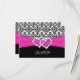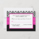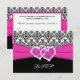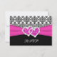 Cette carte de réponse RSVP en damas noir et blanc a un ruban imprimé rose vif et une broche en cœurs de diamants scintillants faux qui correspond à l'invitation de mariage présentée ci-dessous. Si vous avez besoin d'autres articles assortis ou si vous souhaitez une autre combinaison de couleurs, veuillez envoyer un e-mail à niteowlstudio@gmail.com avec votre demande.
