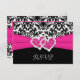 Cette carte de réponse RSVP en damas noir et blanc est ornée d'un ruban imprimé rose vif et d'une broche en cœurs en diamants scintillants imprimés qui correspond à l'invitation de mariage présentée ci-dessous. Si vous avez besoin d'autres articles assortis ou si vous souhaitez une autre combinaison de couleurs, veuillez envoyer un courriel à niteowlstudio@gmail.com avec votre demande.