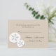 Jolie carte RSVP de réponse mariage faite dans un arrière - plan couleur sable, avec des graphiques en relief à l'aspect de dollars de sable blanc, dans le coin inférieur gauche. Customisez le texte en fonction de vos besoins. Produits mariages correspondants disponibles, voir liens ci-dessous.