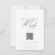 Une carte de réponse élégante et moderne dotée d'un code QR pratique pour des réponses faciles des invités. La typographie élégante et le design minimaliste la rendent parfaite pour les mariages contemporains. Le verso de la carte présente un coin floral délicat, ajoutant une touche romantique et sophistiquée. Idéal pour les couples qui apprécient à la fois la beauté et la commodité dans leur papeterie de mariage.
