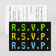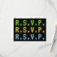 Cette carte de réponse nerd présente le message "R.S.V.P." sur le devant. Elle comporte également un formulaire de réponse personnalisé au dos pour que le destinataire le remplisse. Des cartes de réponse comme celle-ci pourraient être utilisées pour savoir qui participera à une douche de mariage, une fête d'anniversaire, une baby shower ou une autre célébration.
