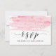 Cette carte de réponse RSVP à motif blush rose aquarelle et demande de chanson dorée est parfaite pour un mariage au thème romantique et doux moderne. Le design féminin luxueux présente une texture rose clair à l'aquarelle avec une touche de poussière de faux paillettes dorées et une police d'écriture calligraphique élégante. Créez votre liste d'invités de mariage et votre liste de chansons de piste de danse en même temps ! Cette carte de réponse de mariage demande commodément aux invités s'ils pourront assister à votre mariage, et quelle chanson les fera danser.