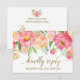 Cette carte de réponse RSVP avec menu de fleurs de pivoine rose et pêche est parfaite pour un mariage élégant. Le design floral présente une belle composition de pivoines à l'aquarelle dans des tons rose pâle et corail assortis à une calligraphie en faux feuilletage doré délicat. Cette carte de réponse de mariage demande commodément aux invités quel repas ils aimeraient à votre réception.