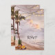 Carte de réponse moderne représentant un coucher de soleil sur la plage avec des guirlandes lumineuses et des palmiers. Au pied de l'arbre se trouve un ananas avec des fleurs. Vous pouvez personnaliser tous les textes. Cette carte de réponse correspond aux invitations.
