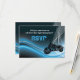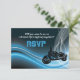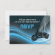 Carte de réponse RSVP de mariage de motard de route bleu, avec une moto sur un fond dégradé abstrait bleu, blanc, noir et une maille blanche. Certains éléments fournis par Clipartandfonts.com.