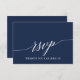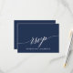 Cette carte de réponse RSVP élégante en calligraphie bleu marine pour site web de mariage est parfaite pour un mariage simple. Le design neutre présente une carte minimaliste ornée d'une typographie romantique et fantaisiste. Personnalisez la carte de réponse en ligne avec votre date de réponse RSVP et l'adresse de votre site web de mariage. Si vos invités n'ont pas besoin de mot de passe pour le site web, vous pouvez remplacer le texte par une autre méthode de réponse RSVP ou un court message pour vos invités.
