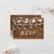 Un magnifique design rustique en bois de grange et dentelle avec une guirlande de jolies lumières pour ces cartes de réponse RSVP de mariage que vous personnalisez pour votre journée magique à venir.
