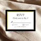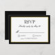 Carte de réponse RSVP pour mariage classique noir et blanc avec une touche d'or. Texte de bloc et de script élégant à l'intérieur d'une bordure noire et dorée. Dos noir.