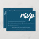 C'est une carte de réponse de mariage moderne bleu marine avec un modèle de choix de repas, qui sera parfait pour n'importe quel mariage. Cette carte de réponse est recto-verso et comporte des monogrammes et le site web du mariage (facultatif) au verso. Tout le texte est modifiable, il suffit de cliquer sur 'Personnaliser ce modèle'. Vous pouvez également changer la couleur de fond, il suffit de cliquer sur "Personnaliser davantage".
