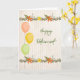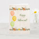 Carte de retraite gaie avec ballons et fleurs sur un arrière - plan beige. Les fleurs sont orange et jaune et les ballons roses, jaunes et verts. Merci à Design Cuts et le Hungryjpeg pour certains des éléments du design.