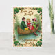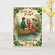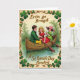Cette carte de vœux représente une scène vintage de la Saint-Patrick encadrée par des vignes de trèfle entrelacées de couleur vert émeraude profond et marron chaud ☘️. Trois enfants aux joues roses partagent une balade silencieuse dans une barque rustique en bois, suffisamment proches que leurs épaules se touchent presque tandis qu'ils se penchent au même rythme doux. Un garçon portant une veste verte et un pantalon jaune ensoleillé est assis à l'arrière, regardant les autres avec un air décontracté et amical. Au milieu, une fille en robe rouge rubis tient une rame, son maintien ferme comme si elle guidait le petit groupe vers l'avant. À la proue, une deuxième fille en robe vert lime et chapeau à large bord rose est tournée vers l'avant, tenant délicatement un petit objet blanc dans sa main 💚. L'arrière-plan est un lavis doux de verts atténués qui ressemble à une rive de rivière calme ou à un feuillage stylisé, maintenant l'attention sur la barque. « Erin go Bragh » apparaît près du haut en lett