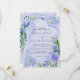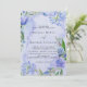 La conception comporte une impression en couleur avec un élément floral dans des nuances de violet et de bleu poussiéreux sur une couronne de feuilles de verdure et des fleurs de pivoine tulipe jacinthe sur un fond aquarelle lilas clair bleu clair. Idéal pour vos célébrations de mariage !