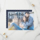 Carte de sauvegarde de date horizontale. Ce design a une apparence et une convivialité décontractées. Au verso, il y a un fond bleu foncé avec des points de couleur or.