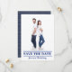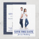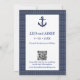 Voici un design amusant pour le couple qui aime la voile ou le bateau. Sous la photo, sur le devant, il y a "SAUVEGARDEZ LA DATE" "pour notre mariage". Au dos, il y a une bordure bleue avec des vagues de couleur or. En haut du design, il y a une ancre bleue que vous pouvez supprimer ou remplacer. Ce design est présenté avec un QR (que vous pouvez créer) qui peut être lié et scanné pour accéder à un site web avec des informations sur le mariage.