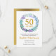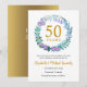 Cette carte d'annonce "Save the Date" pour le 50e anniversaire de mariage présente une délicate couronne de verdure florale faite de fleurs de jacinthe, de plantes et de lilas. Elle peut être facilement personnalisée avec les informations spéciales de renouvellement de vos vœux dorés. Le verso de l'invitation présente vos dates d'anniversaire en texte blanc élégant sur fond doré.