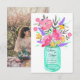 Demandez à vos proches de sauvegarder votre date avec style avec cette carte photo. Sur le devant se trouve un pot Mason turquoise avec un beau bouquet aquarelle coloré. Toutes les informations sont écrites sur un pot Mason avec une combinaison de serif et de script calligraphique. Votre propre photo est au dos pour un toucher personnel. La personnalisation est très facile en un seul clic sur le bouton.