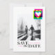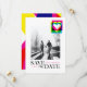 Une carte photo de sauvegarde de date de mariage au design tendance avec une touche de couleur vive dans le style d'impression CMYK.