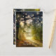 Carte postale de sauvegarde de date avec un chemin magiquement éclairé dans une forêt enchantée avec des guirlandes lumineuses festives.