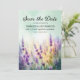 Belle carte de sauvegarde de mariage de printemps/été avec fleurs de lavande violettes. Personnalisé avec votre photo au verso. Achetez des exemplaires imprimés ou commandez en numérique pour partager avec vos amis et votre famille par e-mail ou sur vos réseaux sociaux.