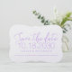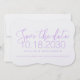 Carte de sauvegarde de date simple, minimale, simple sans photo dans une forme élégante et fantaisiste entre parenthèses en lilas lavande orchidée violet et blanc avec une typographie de script élégante et de grands nombres de date dans une police sans empattement chic. Personnalisez le modèle en sélectionnant les couleurs et les polices que vous souhaitez pour vos faire-part de mariage.
