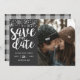 Carte de sauvegarde de date sur le thème de l'hiver avec votre photo personnalisée et des flocons de neige argentés scintillants. Le texte indique "sauver notre date" en lettrage pinceau avec le nom du couple, la date du mariage et la ville et l'état où le mariage aura lieu. Tous les textes sont modifiables. Argent et gris charbon. Le dos de la carte est à carreaux gris.