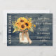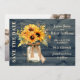 Définissez le ton de votre mariage champêtre avec cette carte de sauvegarde de date de mariage tournesol rustique avec un bouquet de pot mason, un fond en bois et une calligraphie romantique. Idéal pour les mariages d'automne, les lieux de grange ou les célébrations sur le thème du tournesol. Personnalisez facilement avec vos noms, date et message personnalisé pour créer une première impression sincère.