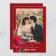 Cartes de sauvegarde de date de mariage rouges avec modèle de photo. Tout le texte est en bas, en script blanc et en polices imprimées. Les prénoms du couple se démarquent en caractères gras, majuscules et imprimés. Une rose rouge réaliste et un bouton de rose ornent le bord. Ajoutez une photo verticale (portrait) pour de meilleurs résultats. Choisissez également l'option de téléchargement instantané pour partager les annonces de mariage en ligne.
