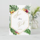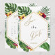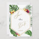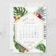 Carte de sauvegarde de date avec design tropical, feuilles tropicales, fleurs jaunes et rouges, géométriques dorés et calligraphie. Facile à personnaliser avec un calendrier au verso où vous pouvez également mettre en évidence votre date avec une petite feuille tropicale.