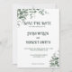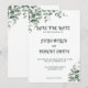 Une belle carte "Sauver la date" dans un design simple et élégant orné de feuilles d'eucalyptus.