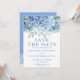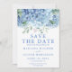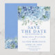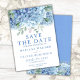 Carte d'annonce de sauvegarde de la date de mariage floral aquarelle avec hortensias pervenche bleus. Personnalisez les noms, les dates et les informations.