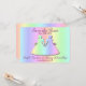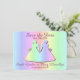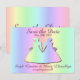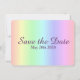 Deux mariées se tiennent la main sur cette carte de sauvegarde pré-invitation colorée pour un mariage lesbien. Leur aspect, et le fond, est l'arc-en-ciel de la Fierté Gay dans des tons pastel. Alertez votre famille et vos amis qu'ils pourraient libérer leur calendrier pour votre grand jour.