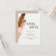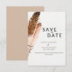 Une carte de sauvegarde de date simple avec une image d'illustration de plume, compatible pour un mariage en plein air (jardin) et une fête de fiançailles moderne en intérieur.