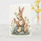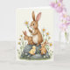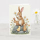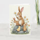 Cette carte représente une scène printanière sereine avec un grand lapin brun debout qui offre une petite fleur blanche au centre jaune ensoleillé, ses joues rosées et son doux sourire dirigés vers le bas comme un ami attentionné 🐰. En dessous, deux lapins plus petits sont assis l'un près de l'autre sur des rochers gris frais, leurs corps inclinés vers l'intérieur comme s'ils partageaient un moment de calme. Le petit lapin de gauche regarde vers le bas avec une inclinaison de tête timide et pensive, tandis que celui de droite regarde le lapin plus grand avec des yeux brillants et admiratifs 🐇. Entre eux, un minuscule poussin jaune se niche au milieu, ajoutant un point de connexion doux entre le trio. Autour des rochers et le long du premier plan, des tiges vertes et de l'herbe sont parsemées de fleurs blanches ressemblant à des marguerites qui encadrent le groupe comme une bordure de jardin. L'arrière-plan reste d'un blanc cassé doux, laissant les bruns chauds, les gris doux et les verts frais ressortir sans distraction. Un court message de Pâques est placé près du haut dans une couleur claire et printanière, avec un texte plus petit