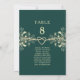 Elégante carte de sièges vert émeraude et or aux accents floraux et à la conception romantique de la corde. Cette carte de table recto verso permet aux clients de trouver facilement leur place à la réception. Parfait pour les mariages classiques, classiques ou modernes en toute saison, surtout en automne et en hiver. Personnalisez avec des numéros de table et des noms d'invités pour correspondre à votre thème mariage. Coordonnée avec les invitations, menus, programmes et papeterie correspondants de la collection mariage émeraude et or.
