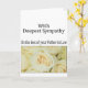 Avec la plus profonde sympathie sur la perte de votre Père en droit Express votre sympathie en temps de douleur en envoyant une carte personnalisée à votre famille et vos amis. Cette carte est également disponible dans d'autres versions, (famille) relation spécifique et dans certaines langues non anglaises. Suggestion textuelle intérieure : Condoléances à vous et à votre famille pour la perte de votre être cher. Nos pensées vous accompagnent en cette période de tristesse. Avec Une Sympathie Profonde.