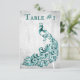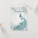 Numérotez vos tables de réception avec une carte de table de réception de mariage à vigne et feuille de paon sarcelle. Le design de la carte de table présente un fond grunge gris clair avec un paon sarcelle vibrant avec un ornement de vigne feuillue. De la papeterie de mariage supplémentaire est disponible avec ce design également.