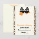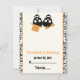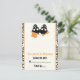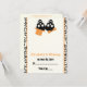 Carte de table de mariage Halloween crânes élégants orange, représentant un couple de crânes noirs mariés sur fond ivoire et une bordure à motif de crânes. Le marié porte un chapeau orange et la mariée un noeud orange. Pliez la carte le long du centre.