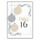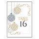 Carte de numéro de table mariage | Baubles de vacances minimaux Noir et Or - Design original par ©WhimsicalArtwork™ - Trois ornements de Noël rayés noir et or pendent à différents niveaux - jumelés avec défilement du coin or et une police contemporaine en font un bel ajout à une suite de faire-part de mariage d'avant-garde très unique - customisez facilement avec vos informations - ceci fait partie de la collection de Baubles de vacances minimaux Noir et Or moderne Une combinaison de calligraphie une disposition de texte minimaliste et contemporaine en fait une suite mariage de style tendance. Il fait partie d'une collection de papeterie mariage avec accessoires mariages assortis par BarefootBride™.